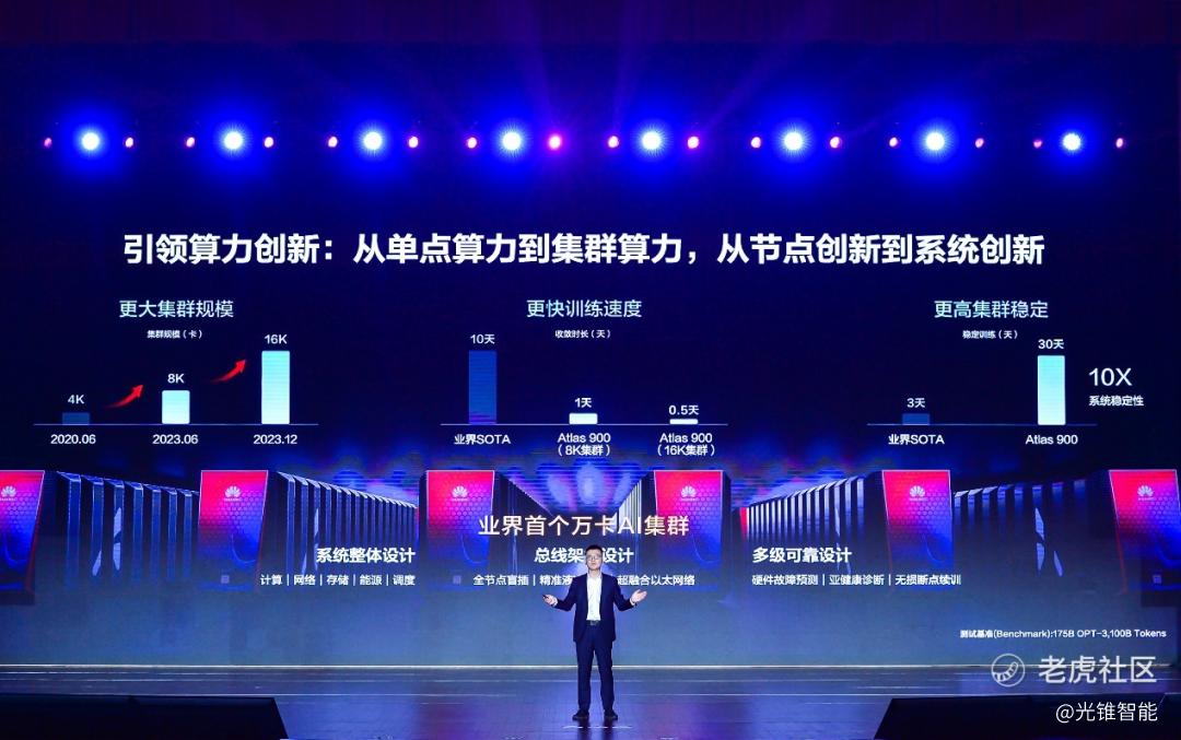 华为轮值董事长胡厚昆表示,升腾AI的集群相当于把AI的算力中心当做一台超级计算机来进行设计,使得升腾AI集群的性能效率达到10%以上的提升,而且系统稳定性得到十倍以上的提高。
