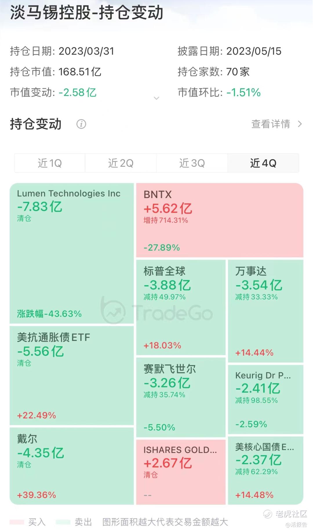 而在美股市场,截至3月末,淡马锡的持仓公司共有70家,持仓市值168.51亿美元。近一年来,淡马锡主要增持了BioNTech(BNTX.US)、英伟达(NVDA.US)等公司以及京东(JD.US)、阿里巴巴(BABA.US)、拼多多(PDD.US)等中概股,对百胜中国(YUMC.US)进行了建仓,清仓了Lumen(LUMN.US)、戴尔(DELL.US)等。