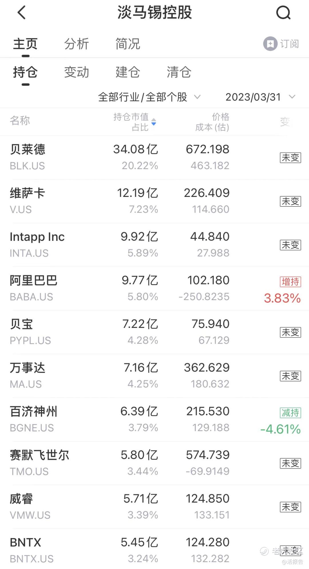 截至3月末,淡马锡在美股市场的前五大持仓股分别为贝莱德、Visa、Intapp、阿里巴巴和PayPal,五大核心仓的合计持仓占比达43.43%。