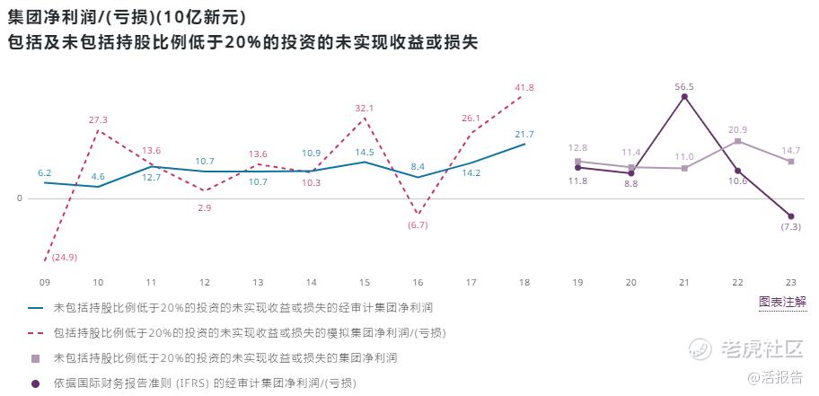 从集团财务状况看,2023财年淡马锡罕见地出现了73亿新元的净亏损。公司解释是由于未实现市值损失所致(持股比例低于20%的投资的未实现市值损失为220亿新元)。若不包括未实现市值损失,集团运营利润为147亿新元。