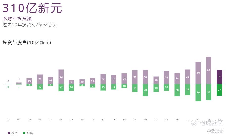 面对全球市场的不确定性,淡马锡在过去一年放缓了投资步伐,2023财年310亿新元的投资额仅为上一财年的一半,而净投资额仅有40亿新元,较上一财年的240亿新元缩水8成以上。