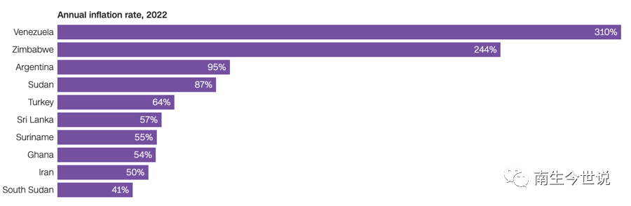 第二名是津巴布韦,物价是去年的近3.5倍,同比暴涨244%;第三名是阿根廷,物价是去年同期的2倍左右,同比上涨95%。