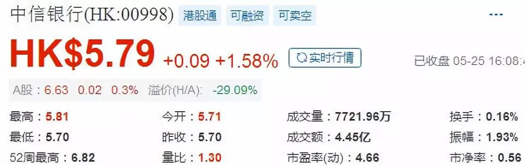 对于银行类,例如港股上市的银行公司中信银行(HK:$(00998)$),最新的数据显示只有0.56PB,也就是说市值仅有公司资产价值0.6倍;银行业作为经营资产(资金)的行业,显然,PB是一个很重要的参考指标。如果我们在结合其它的因素,如盈利情况、分红及其它银行类指标,那么对于0.56PB的中信银行,投资者应该不难去判断它的估值贵贱了。