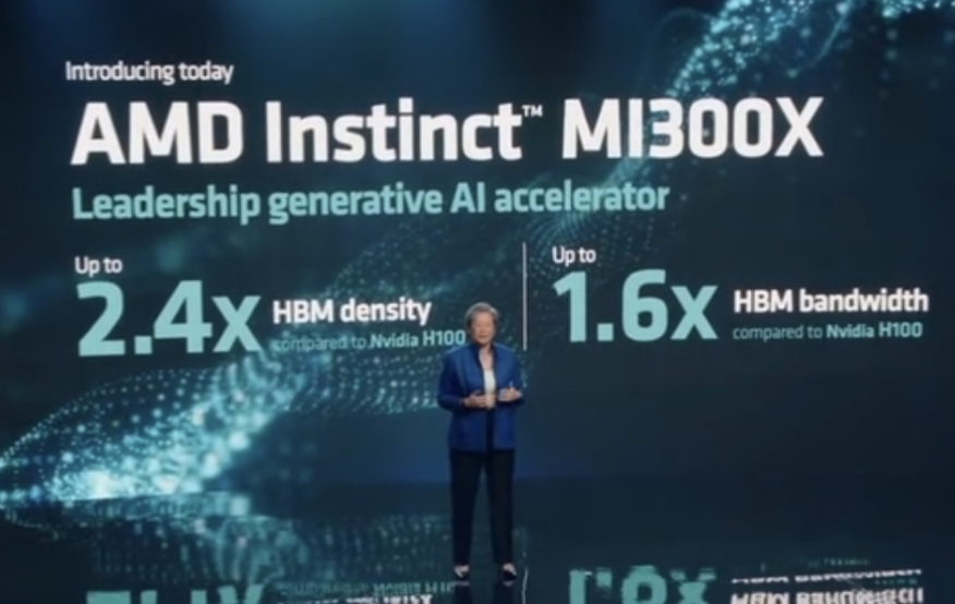 为了抓住这个好时机,苏姿丰在此前的“AMD数据中心与人工智能技术首映会”上,带来了数据中心APU(加速处理器)Instinct MI300和第四代Epyc处理器的最新消息。在演讲中,她将两款产品的性能参数直接对标了英伟达的H100芯片和英特尔的至强8490H。此举被业界认为是AMD将同时挑战英伟达和英特尔在GPU和CPU领域的霸主地位。