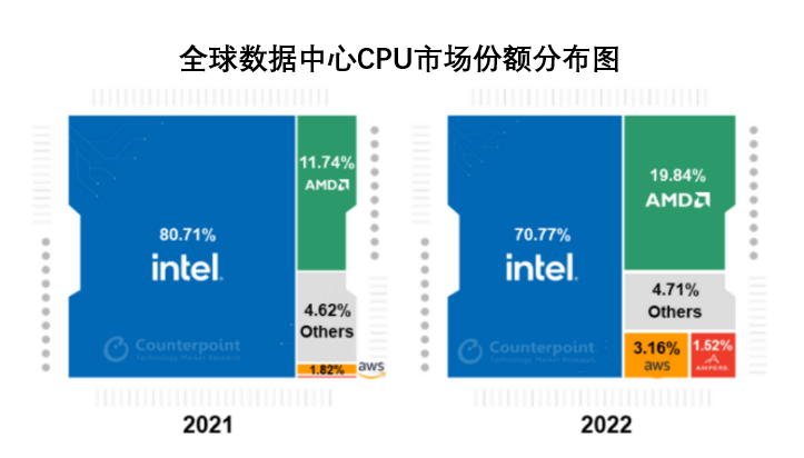 从目前的市场份额来看,市场研究机构Counterpoint的统计数据显示,2022年,英特尔继续在数据中心CPU市场占据主导地位,但市场份额却下降了10%至71%,而AMD的市场份额迎来了增长,达到了20%。