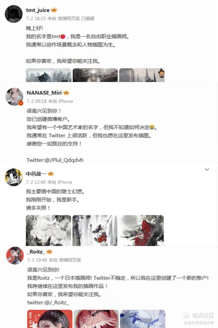在一片“Twitter被限制”“请多关照”的声音中,新入驻的画师们拿出标准的营业态度,上来先展示自己的绘画作品、表明来意与喜好,高质量的海外画师立刻让微博进阶为网友口中的“赛博卢浮宫”。