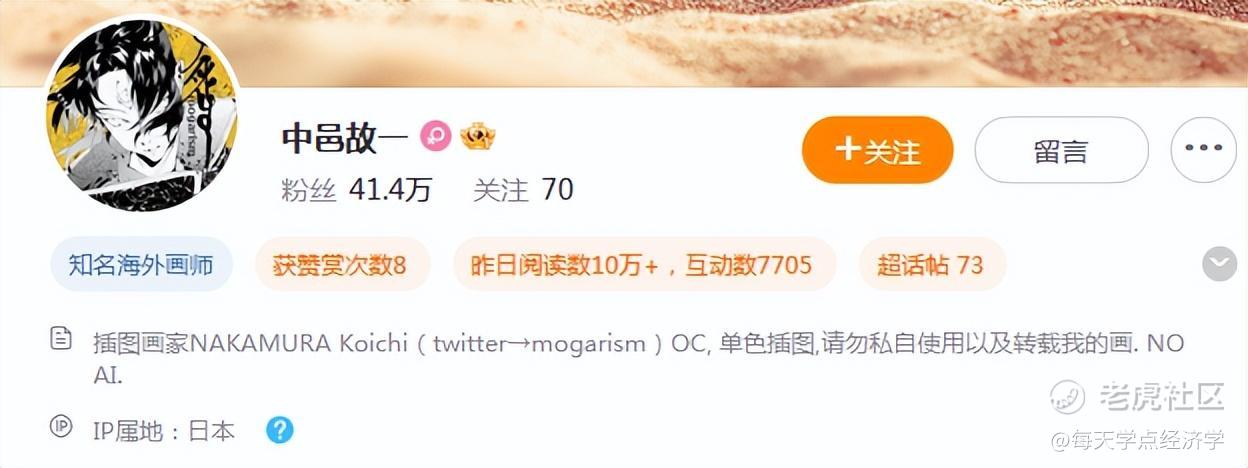 例如日本插画师@中邑故一,他的绘画作品有自己独特的世界观、画师本人笔触独具特色、主要画想象中的中国古代隐士,在推特上有近8万粉丝。