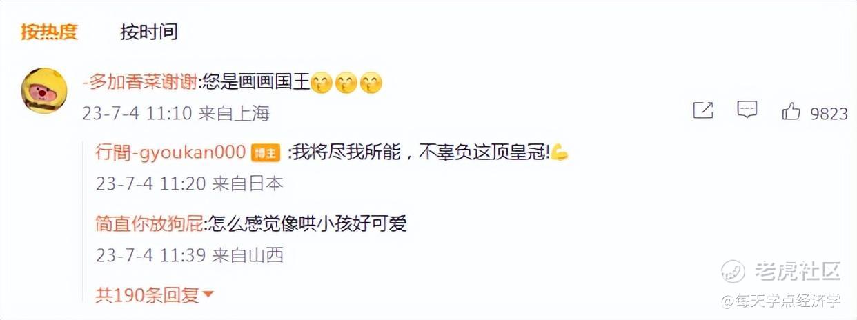 有粉丝为画师充了微博会员,使得画师ID后面会有一个会员皇冠标识。当画师问为什么会有皇冠时,评论区“您是画画国王”的回答犹如哄小孩一般。