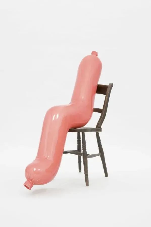 在32件展品中,我们看到了在2017年曾经在上海外滩美术馆做过个展的菲利普•帕雷诺的作品《华盖》,以及曾经在贝浩登展出过的加百列•里科的作品《将事实转换成另外一个也满足规则的对象》(Change the obvious into another object that also satisfies the rule),这个像一个粉红肉肠一样的限量版雕塑作品,体现了人类与自然界的关系。很有意思的是在油罐艺术中心的另外一个展馆里面,艺术家徐毛毛的展览《啵波咔》也在进行中,巨大的全新画作都是色彩绚丽的丙烯喷绘作品,那些大大小小的眼睛以及香肠状的双头乳房还有各种人脸组成的画面,让观众感受到一种Q弹柔润的风格。轻盈自由的气氛,洋溢在大雨倾盆的午后空间。
