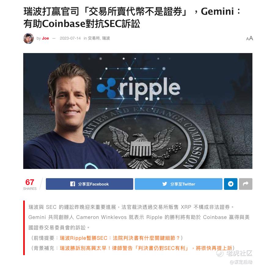 XRP打赢了官司,“交易所代币不是证券”,市场解读是这有助于COINBASE对抗SEC的诉讼官司,当日COINBASE于是大涨24%。
