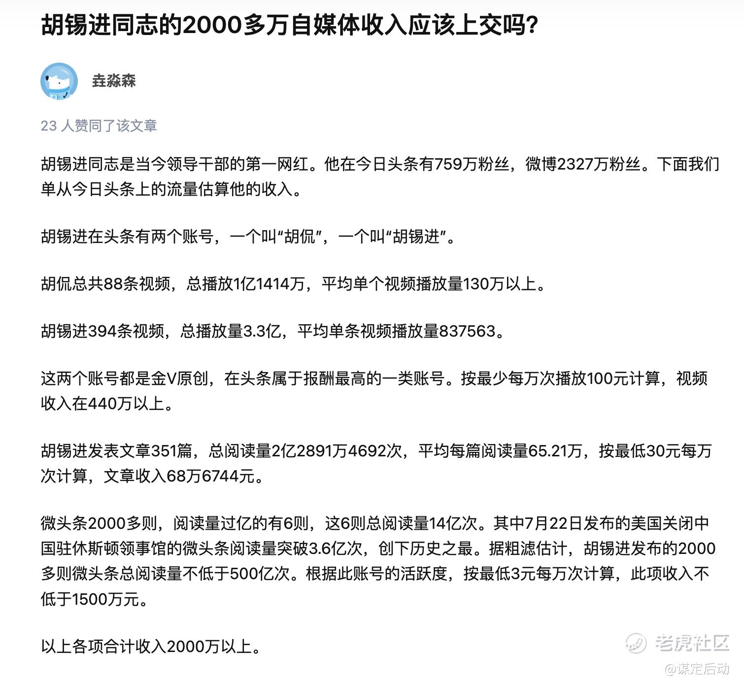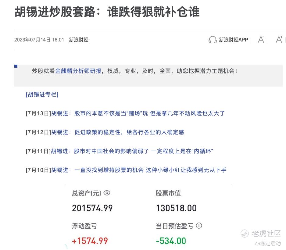 【本期导读】“股民”胡锡进炒股的新闻这段时间刷屏了投资圈。像胡锡进这样的人,是根本不需要炒股赚钱的,有多出来的心思和时间花在文章、视频的流量上比买哪个股票都强,这个道理他肯定懂的。别忘了胡锡进还是国内极少数能合法翻墙的人,体制内的消息渠道更非普通人可比,墙外墙内到底什么情况他心里一清二楚的,炒股对他而言只是一个政治任务,就是现在大A里的韭菜少了,总要想办法催一些出来。