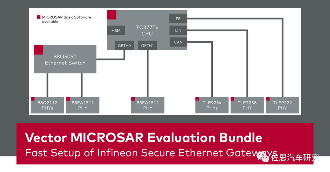 以太网交换机软件系统复杂,需要AUTOSAR软件厂家配合,同时AUTOSAR软件厂家也会挑选卖得最好的以太网交换机芯片,为其定制一套基础AUTOSAR软件,Tier1可以选择购买芯片以及附带的AUTOSAR软件,比如上图的VECTOR为Marvell的88Q5050网关系统定制了AUTOSAR。