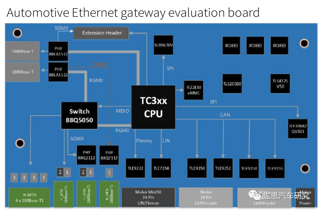 英飞凌推荐的下一代汽车网关设计,以太网交换机即图上的88Q5050,物理层则用了4片。
