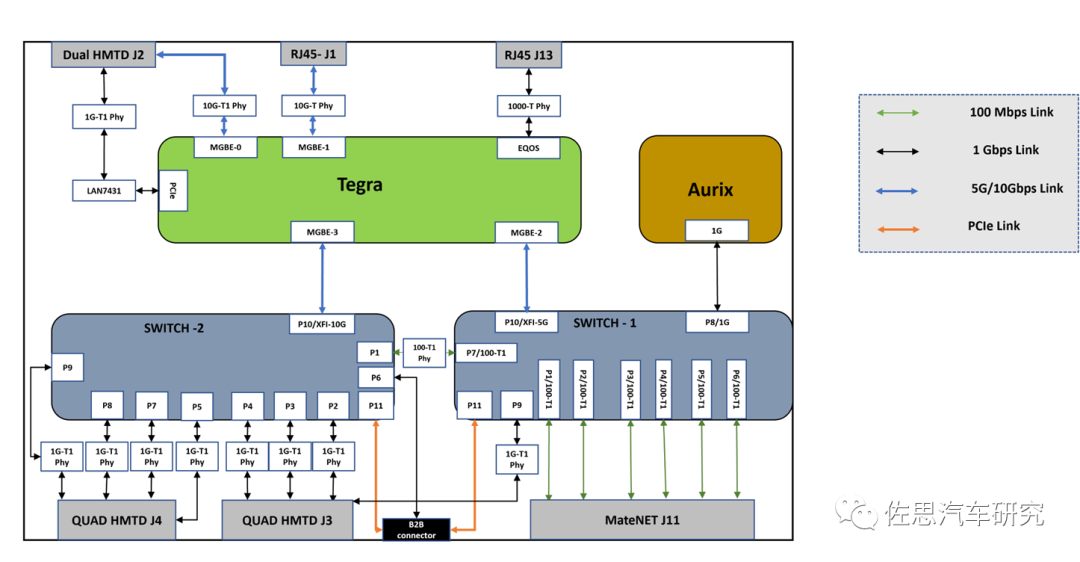 典型的中央计算Zonal架构,每个Zonal网关内部都包含一个以太网交换机。