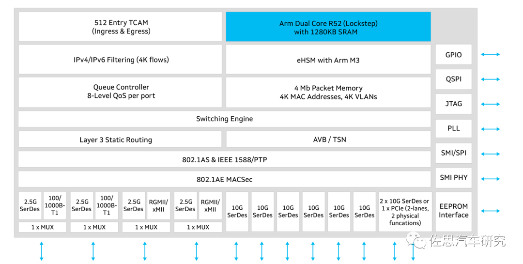 针对ADAS系统,VECTOR选择Marvell的88Q5072。2022年5月Vector发布了第一个支持AUTOSAR并适用于Marvell Brightlane以太网交换机88Q5072的软件解决方案。交换机CPU中运行的软件在模型定义、分布和模块开发方面遵循AUTOSAR方法论。通过将大量以太网通信相关的代码转移至交换机上运行,使得主机微控制器的CPU资源获得释放,从而更高效地运行其它任务。此外,Vector的交换机软件支持某些安全相关功能,例如防火墙和MACsec。这也是目前使用最广泛的88Q5072。