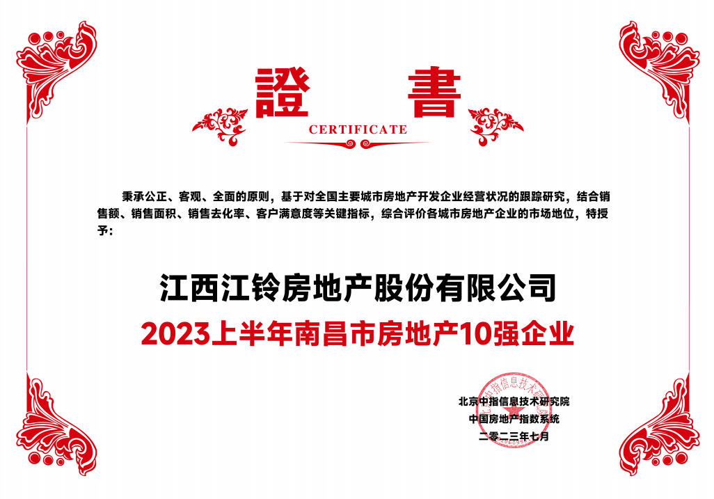 江西江铃房地产股份有限公司(以下简称:江铃地产)凭借稳健的经营能力、出色的项目销售市场表现,荣获“2023上半年南昌市房地产10强企业”称号。
