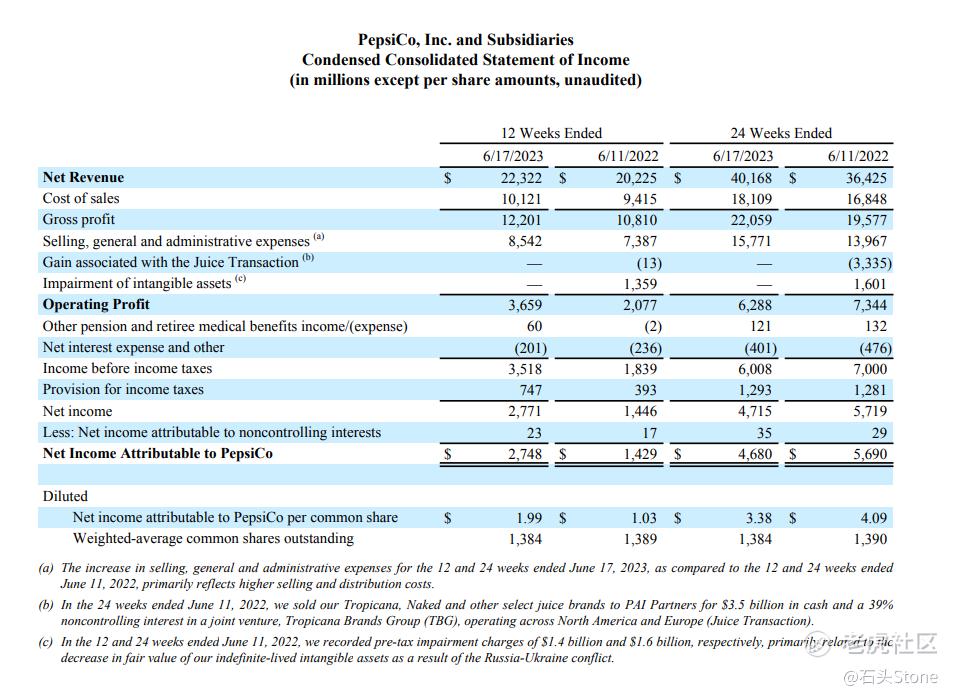 根据2023Q2财报,百事集团营收223.23亿美元,同比增长10.36%,其中净利润为27.48亿美元,同比增加92.3%,每股基本收益为1.99美元。