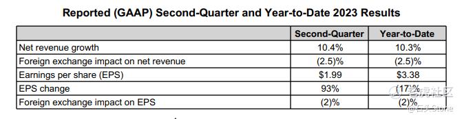 根据2023年Q2财报,营收增长10.3%,除美国地区外的区域影响持平,第二季度每股营收1.99美元,2023半年每股营收为3.38美元。