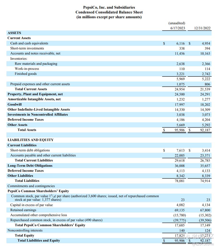 根据财报中的合并现金流表来看,目前百事集团公司账面拥有现金以及等价物约为61.16亿美元,应收账款及票据净额为114.56亿美元,总资产为249.54亿美元。