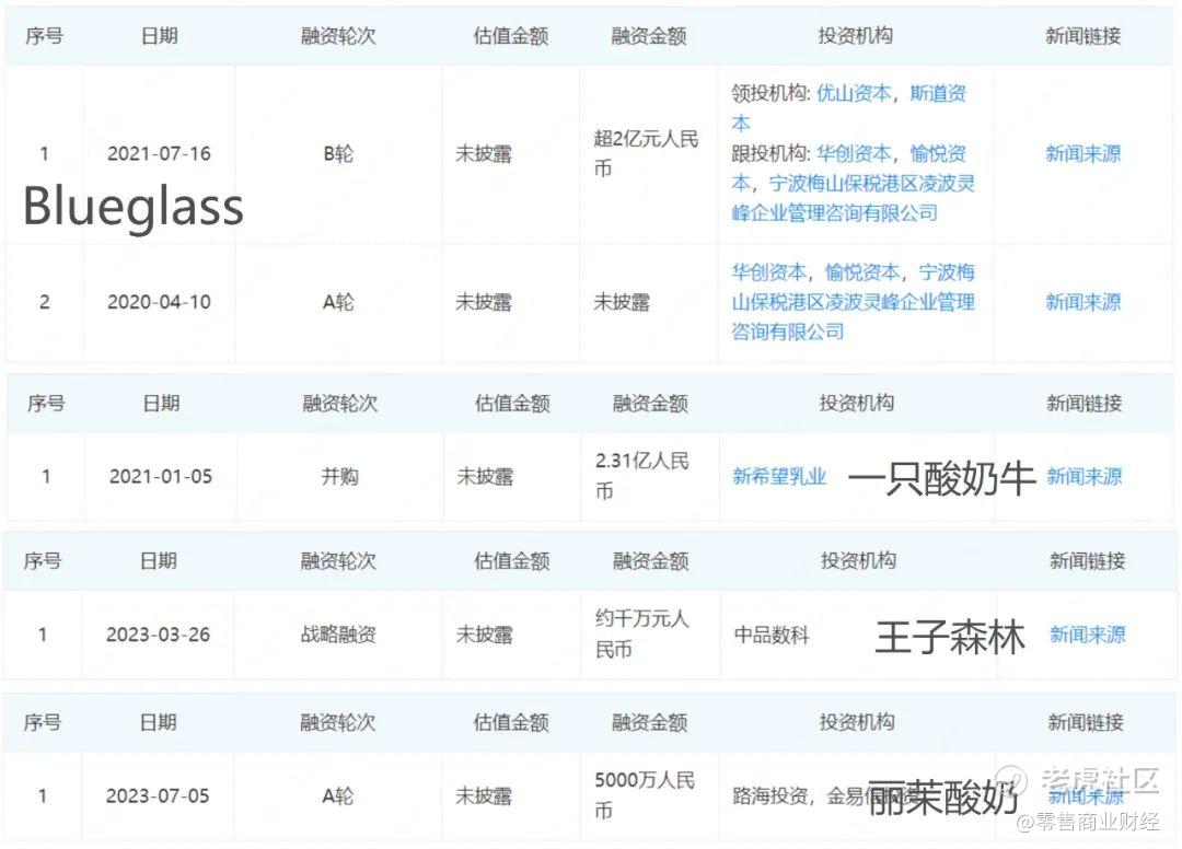2021年,Blueglass获得超两亿元的B轮融资,新乳业以2.31亿元的价格收购了一只酸奶牛,即使是在新消费融资沉寂的2023年,也先后有王子森林、丽茉酸奶获得融资。