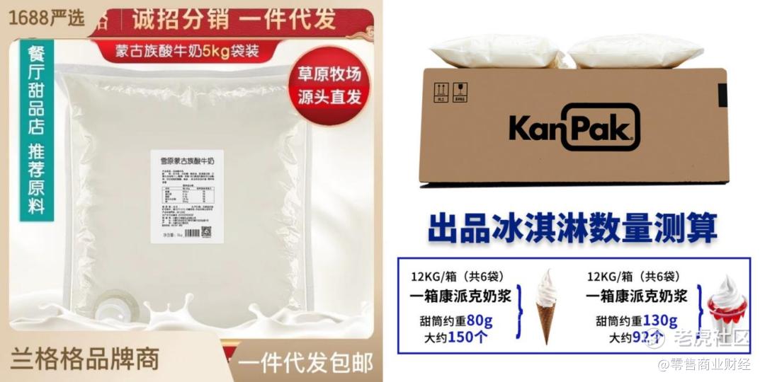 左:兰格格蒙古族酸牛奶 右:康派克冰淇淋奶浆 图源:1688