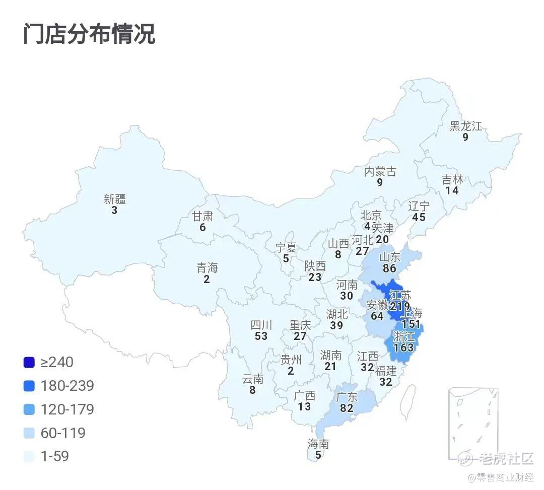 以人均客单价40+元的Blueglass为例,品牌以直营大店为主,营造第三空间氛围,选址主要在一线城市的高端商圈。