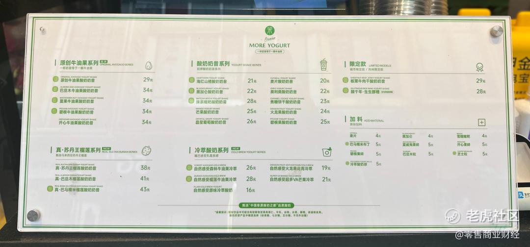 笔者走访上海一茉酸奶门店发现,仅“酸奶+水果+坚果/小料”的组合便能卖到20元以上,牛油果、苏丹王榴莲系列产品更是超过了30元、40元。