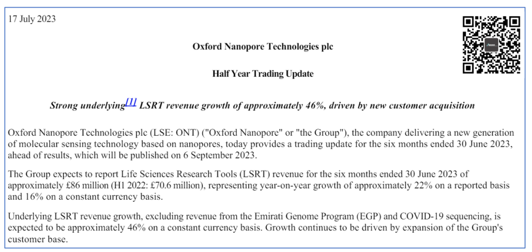 2023年7月13日,全球领先纳米孔测序技术公司Oxford Nanopore宣布了初步的2023年上半年经营状况。