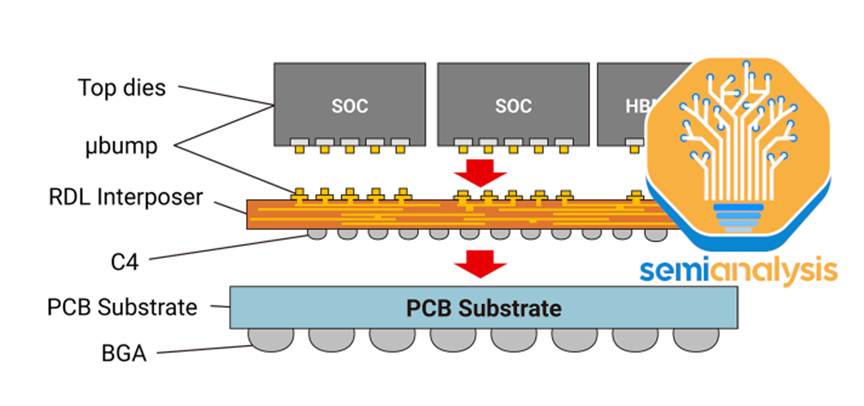 CoWOS-R使用在具有再分布层(RDL)的有机衬底上,而不是硅中间层。这是一个成本较低的变体,牺牲的I/O密度,由于使用有机RDL,而不是基于硅的插入物。正如我们已经详细介绍的,AMD的MI300最初是在CoWoS-R上设计的,但我们认为,由于翘曲和热稳定性问题,AMD不得不使用CoWoS-S。