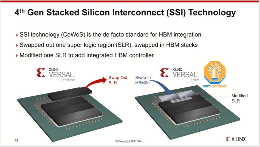 虽然3D封装技术,如台积电的SoIC可以直接在逻辑上堆叠芯片,但由于热量和成本,它对HBM没有意义。SoIC在互连密度方面处于不同的数量级,更适合用芯片堆叠来扩展片内缓存,这一点可以从AMD的3D V-Cache解决方案中看出。AMD的Xilinx也是多年前将多个FPGA芯片组合在一起的第一批CoWoS用户。