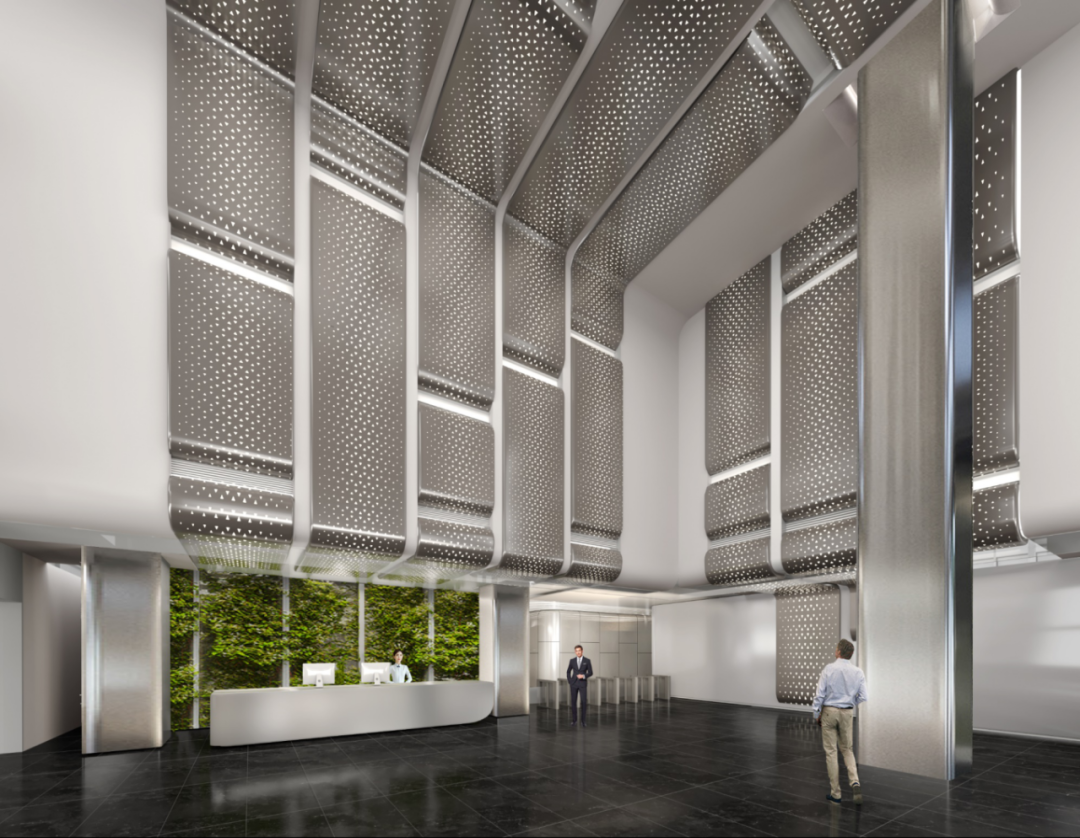 项目地面采用暗色系大理石石材,为大堂空间营造大气庄重的底色,墙面运用独具“呼吸感”的穿孔金属饰面,并将视觉向上引导,提升空间的广阔感,顶部配合极具艺术性的吊顶装饰,呈现出大剧院式恢弘的出入“仪式感”,为企业塑造非凡的形象封面。