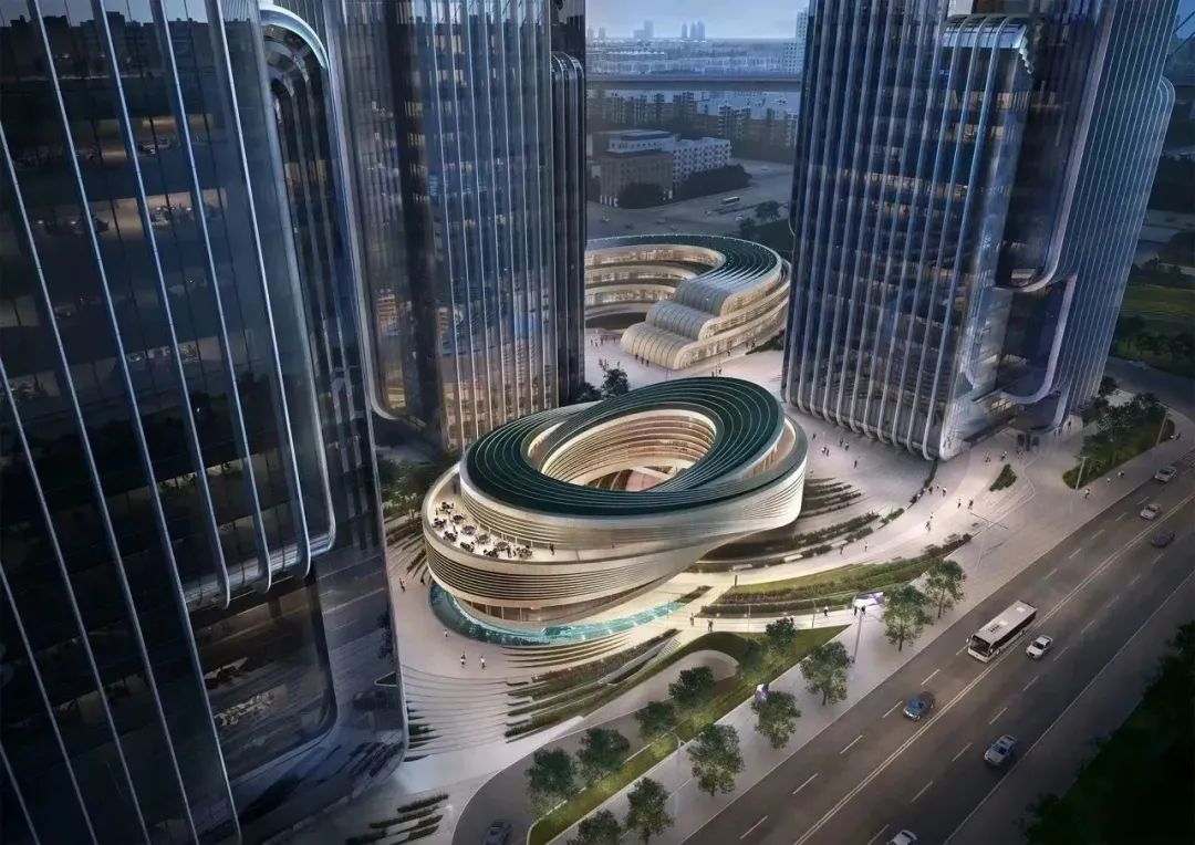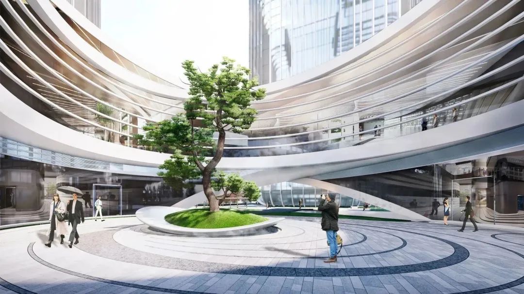商业中心设计灵感源于城市的流动与能量、滨江水岸的绵延风光,其鲜明的“涟漪状”空间设计,渐次向外荡漾,呈现空间的连续性感受,通过“怡人水景”“互动式开放多媒体区”等特色场景,为人们提供绿色、人文、交互的休闲场域。