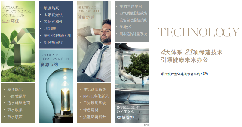 中国节能·上海首座以绿色建筑标准最高级别“绿色三星标准”统筹,通过21项绿建技术,构筑生态、节约、舒适、智慧四大前沿绿建体系。