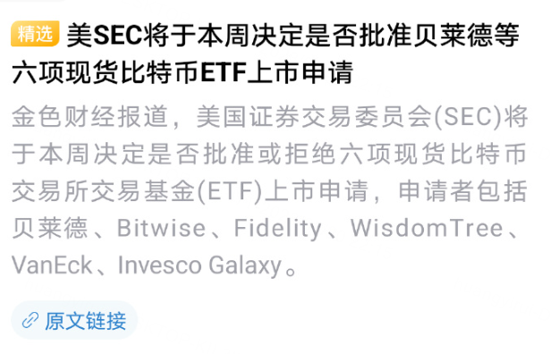 本周最大的事件,无异于sec对于BTC的ETF之批复,批准涨,拒绝跌,这没啥可说的,我只说我的做法:现价吃进,如果批准了,肯定会涨上去,我跟着吃肉。拒绝了的话,套住我而已,我持币装死,用时间来解套。总之,加密牛市里,我不会放过每一个机会。