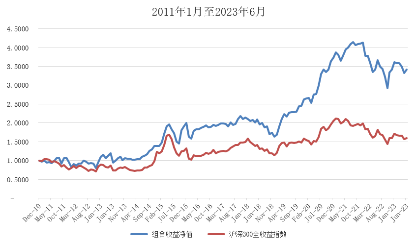 实际组合从2011年初至2023年上半年净值是从1元至3.41元。年化收益率是10.3%。