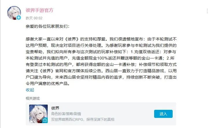 例如,莉莉丝在去年被迫连砍两款自研二次元游戏;西山居也只能弃卒保车,关停已经获得版号的《彼界》,留住另一款更重要的《尘白禁区》;就连腾讯在二次元领域更多靠投资,自研产品目前仅有《白夜极光》。
