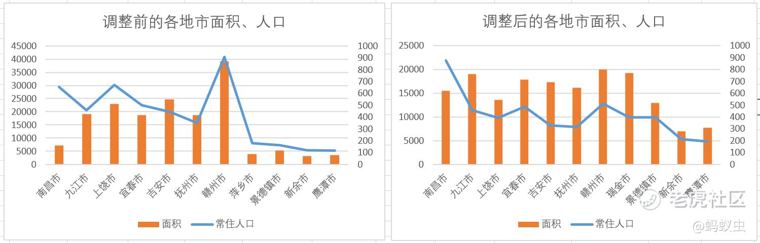 相比之前,调整之后的11市,不再“大的太大、小的超小”。下图调整前后的数据对照更为直观,无论是面积还是人口,在调整后,各市的不平衡状况大为改观,整体均衡、布局合理。