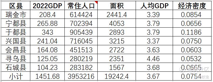 届时新成立的瑞金市,辖8县,辖区面积1.92万平方公里,常住人口395万,1400亿元GDP。2022年人均GDP仅为3.67万元,几乎只有省人均值的一半,全国的4成。作为江西省内最落后的地区,新瑞金市未来面临的挑战依然严峻。
