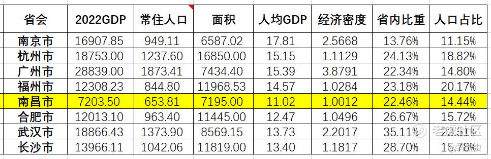 没错,我又用数字来说话了。周边8省份的省会相关数据见下图,南昌市的经济首位度(即图中的省内比重)为22.46%,与苏浙粤闽等经济发达省份的省会基本持平,低于安徽、湖北、湖南省会,而后三者恰恰是强省会战略的受益者。不要忘记,它是以14.44%的低人口占比实现这一目标的,看似弱的南昌其实是一个“强”省会。