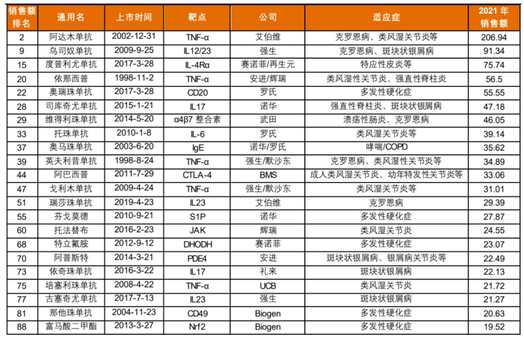 以2022年全球药品TOP10(刨除新冠药物)为例,自免药物占其中三席,依次为修美乐、乌司奴单抗、度普利尤单抗。