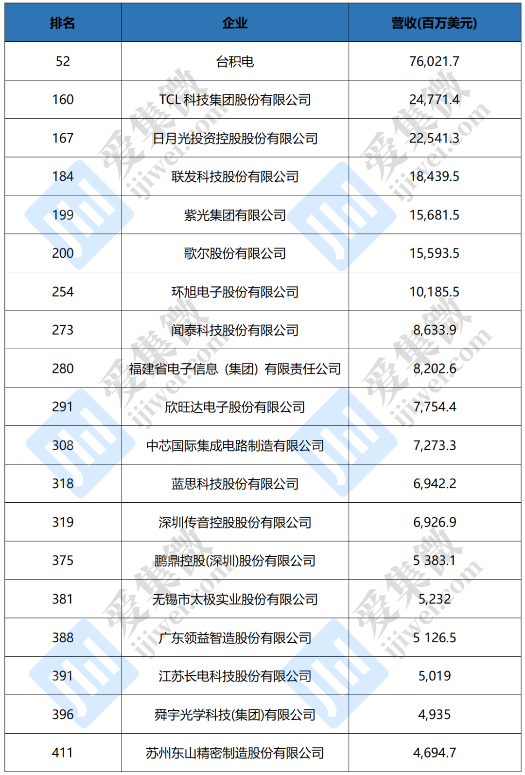 半导体行业联盟消息,7月26日,财富中文网发布了最新的《财富》中国500强排行榜,19家半导体、电子元件企业上榜。其中,台积电2022年营收达76,021.7百万美元,排名第52,位列半导体、电子元件榜首位;TCL科技营收达24,771.4百万美元,排名第160;日月光投控营收达22,541.3百万美元,排名第167。