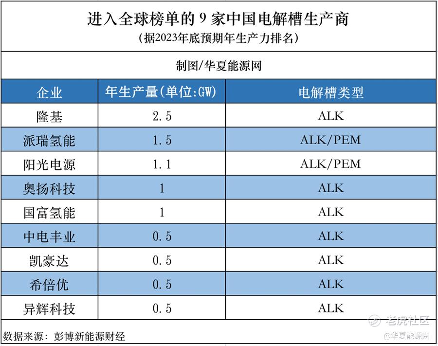 根据彭博新能源财经预测,到2030年全球电解槽装机规模将增长120倍以上。而按预期年生产能力来排名,全球前20家公司的年生产量共计26.4GW,在这20家制氢企业的名单上,共9家企业来自中国,包括:隆基、阳光电源、国富氢能等。