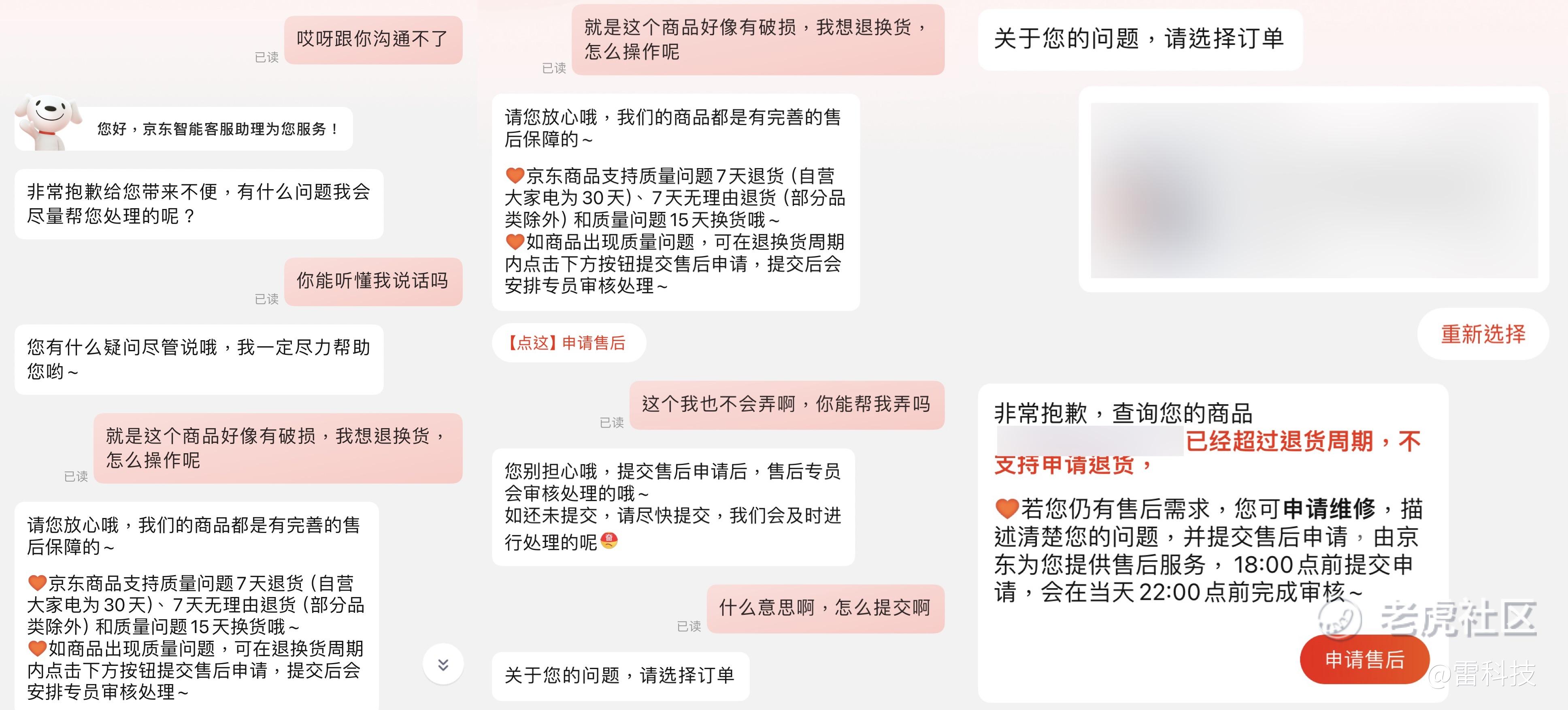 京东、淘宝和天猫智能客服是没有办法识别到用户遇到的难题,就像小雷一直表示「不会操作」、「看不懂」,但智能客服也不会自动地转进人工客服,也没法自动帮助小雷进入售后流程。