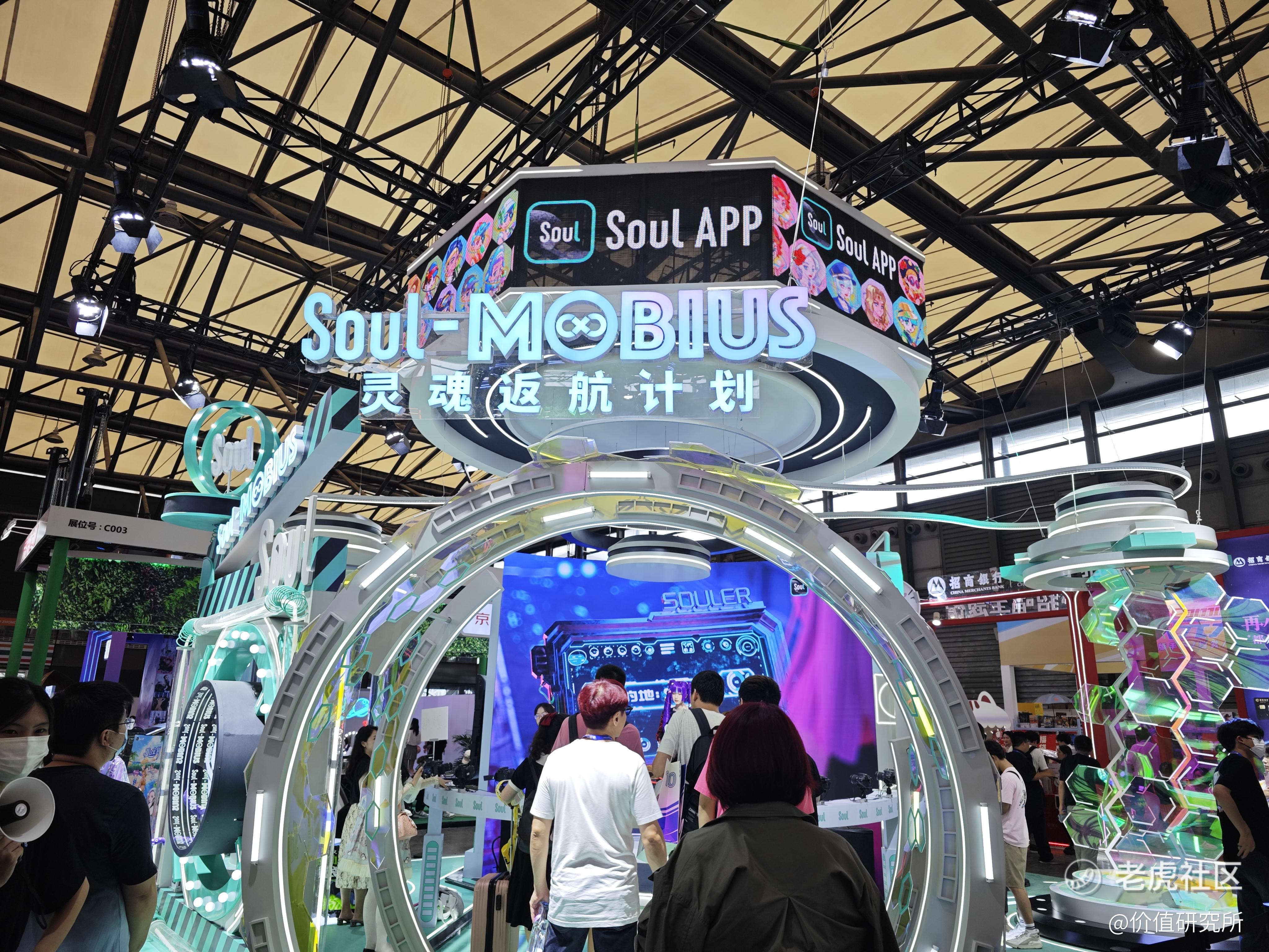 比如Soul的展位打出了“灵魂返航计划”的slogan,主推旗下的数字藏品IP“莫比乌斯”。从现场可以看到,Soul展出了大量“莫比乌斯”系列捏脸形象,展厅被设计成仿太空舱造型,还有精心打扮的COSER和观众合影、互动。