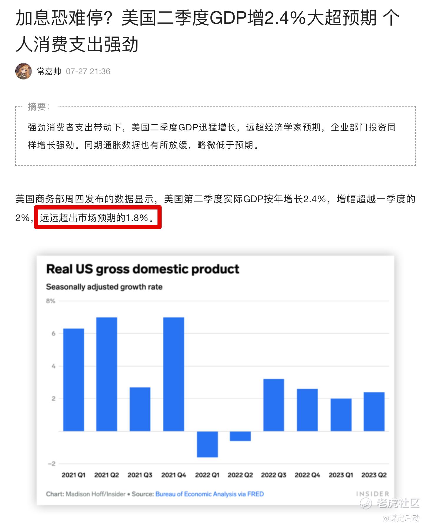 上个公布的美国第二季度GDP环比增长2.4%,远超预期的0.8%。要知道,经济衰退的定义是连续两个季度GDP增长为负数,+2.4%的增长让经济软着陆的可能性大增。