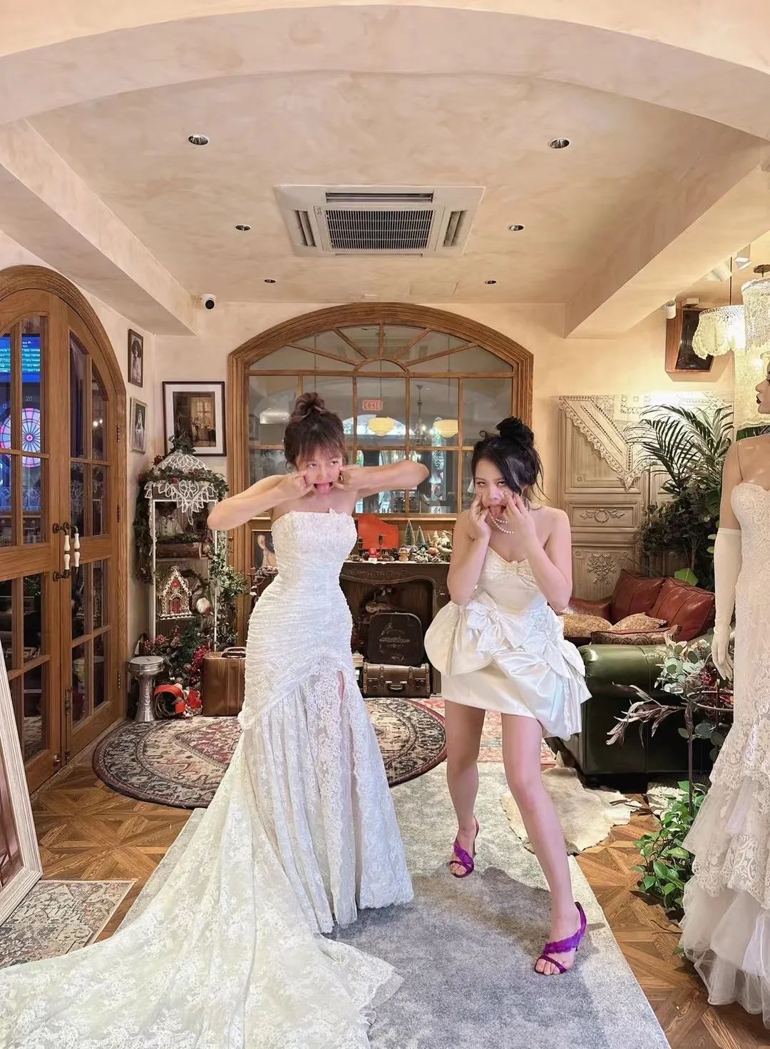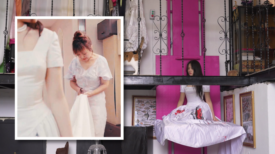 我收藏了很多古着婚纱,19岁妈妈很喜欢,我就借给她穿。给她化妆,蹲在地上帮她整理裙摆,拍好看的照片,一件一件地换。