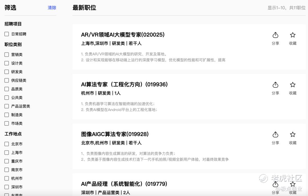 一个例子可以说明,此前vivo相关的AI工程师已经超过1000名,仍在源源不断投入,将更多AI研发人才纳入囊中。vivo官网最新招聘显示,其正在招聘大量AI算法专家、AR/VR领域AI大模型专家、图像AIGC算法专家、AI产品经理,3D光学动捕算法工程师、工作地点位于深圳、杭州、重庆等地。
