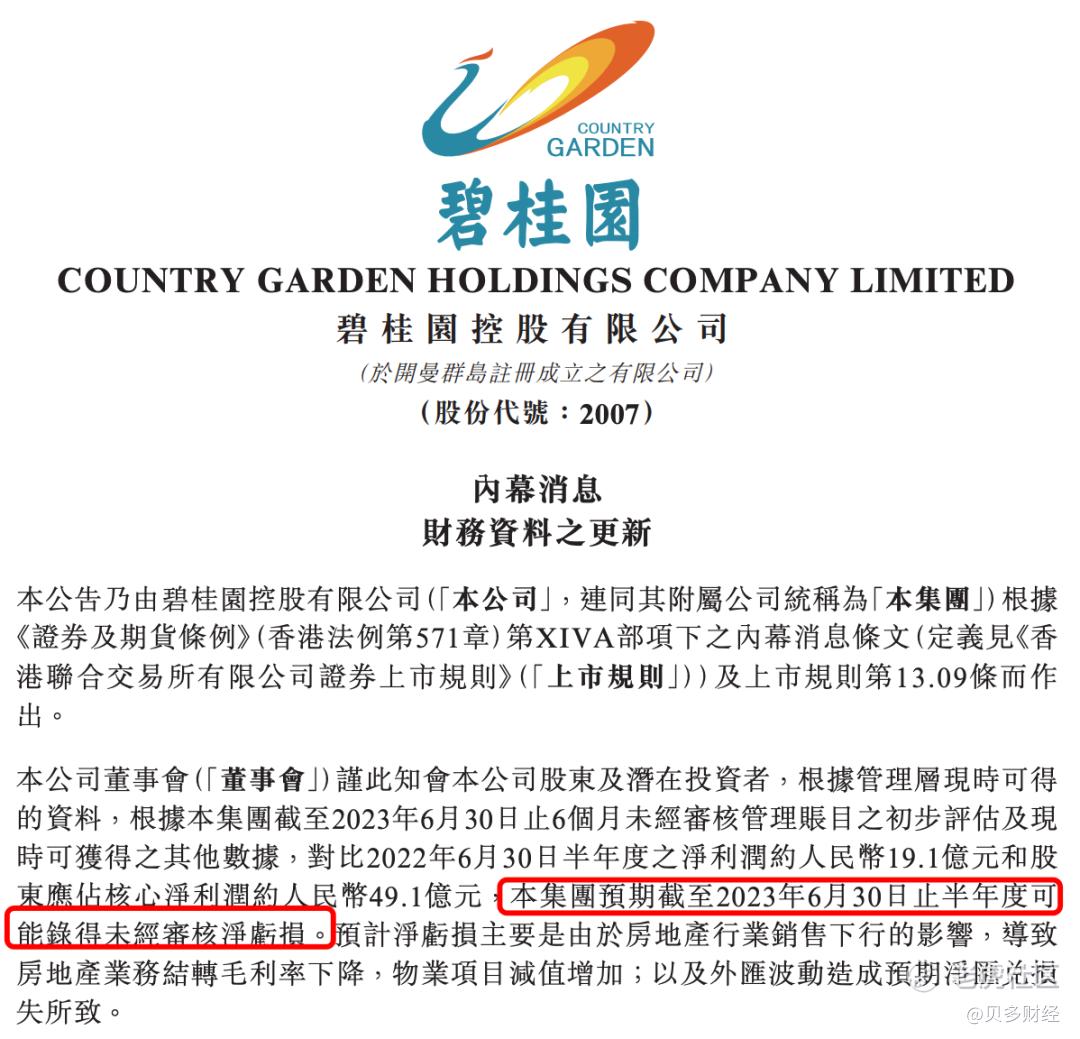 而今,碧桂园的一纸公告,则表明了其在2023年上半年将录得亏损。