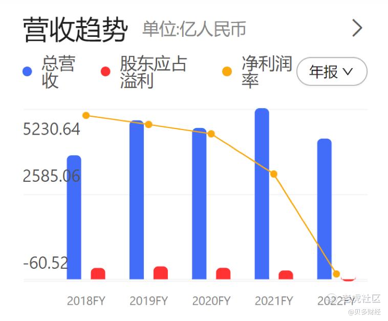 但碧桂园下行之势并未改变。2022年财报显示,碧桂园收入约为4303.71亿元,较2021年度的5230.64亿元下降约17.7%;全年净亏损60.52亿元,这是碧桂园自2007年在香港上市至今,首次出现全年亏损的情况。