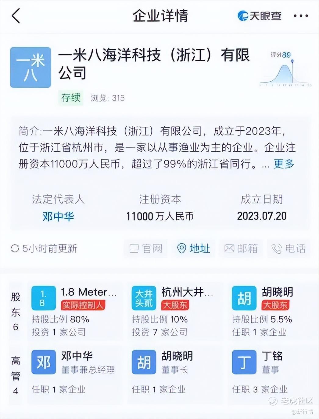 近日,一家名为一米八海洋科技(浙江)有限公司成立,注册资本高达1.1亿,该公司的法定代表人为邓中华;经营范围涵盖水产养殖、食品销售、水产品冷冻加工、海上风电相关系统研发等领域。
